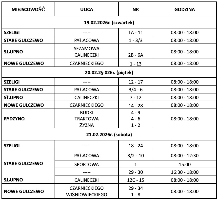 Gmina Słupno informuje, że od dnia 19 lutego 2026 r. rozpoczyna się wymiana wodomierzy, która realizowana będzie przez Konserwatorów Urzędu Gminy. Prace związane z wymianą będą trwały nieprzerwanie do 30 kwietnia 2026 r. w godzinach 8.00 – 18.00 od poniedziałku do soboty.
