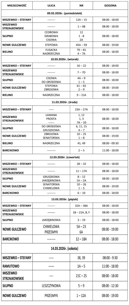 W miejscowościach, w których w określonym czasie wykonywana będzie wymiana wodomierzy może dojść do chwilowych zakłóceń w dostawie wody, w tym do wystąpienia krótkotrwałej przerwy w dostawie wody oraz pogorszenia jakości wody (barwy).