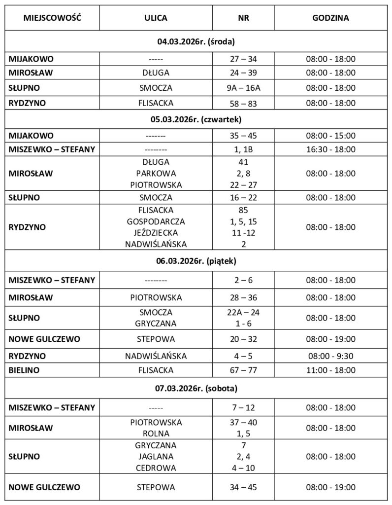 WYMIANA WODOMIERZY [MIJAKOWO, MIROSŁAW, SŁUPNO, RYDZYNO, MISZEWKO – STEFANY, NOWE GULCZEWO, BIELINO]