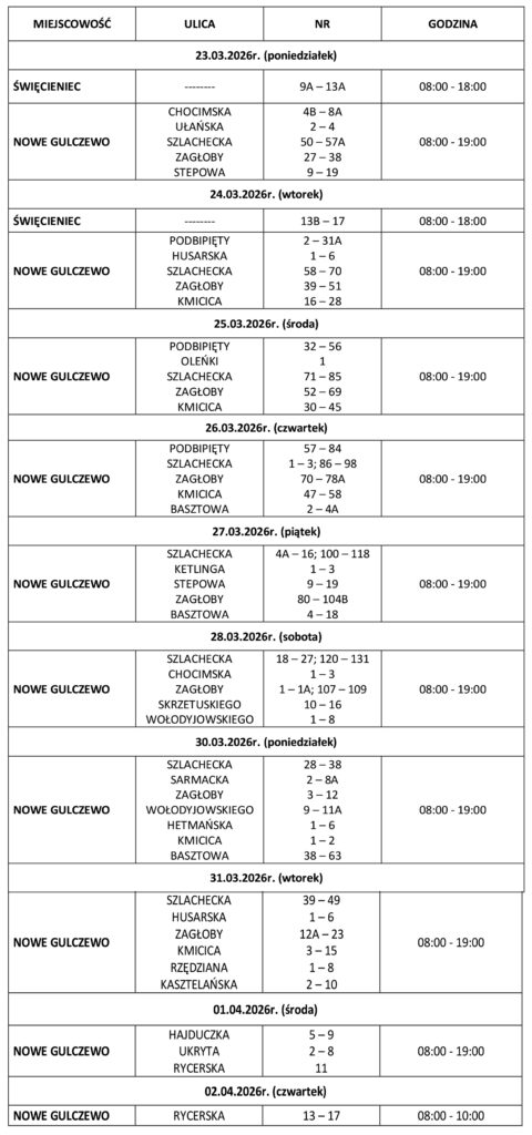 - W miejscowościach, w których w określonym czasie wykonywana będzie wymiana wodomierzy może dojść do chwilowych zakłóceń w dostawie wody, w tym do wystąpienia krótkotrwałej przerwy w dostawie wody oraz pogorszenia jakości wody (barwy).